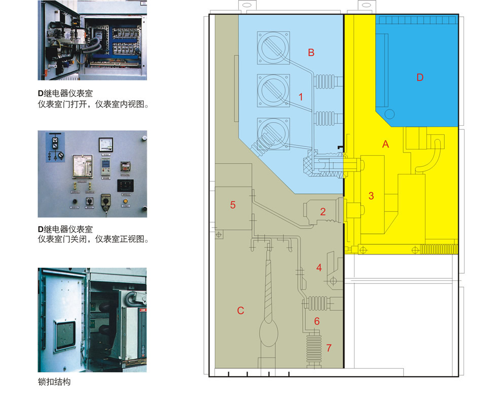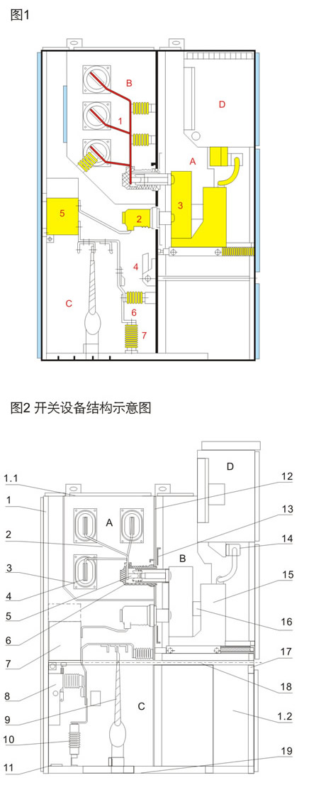 ■符合标准 产品符合下列标准: 1.IEC 298 2.GB 3906-2006 3.DL/T 404 4.GB/T 11022-1999 ■开关柜结构示意图 A.断路器隔室 B.母线隔室 C.电缆室 D.继电器仪表室 1.母线 2.静触头盒 3.断路器 4.接地开关 5.电流互感器 6.电容分压器 7.避雷器 1.外壳 A.母线室 2.分支小母线 B.断路器手车室 3.母线套管 C.电缆室 4.主母线 D.继电器仪表室 5.静触头装罝 1.1泄压装置 6.静触头盒 1.2控制小线槽 7.电流互感器 8.接地开关 9.电缆 10.避雷器 11.接地主母线 12.装卸式隔板 13.隔板(活门) 14.二次插头 15.断路器手车 16.加热器装罝 17.可抽出式水平隔板 18.接地开关操作机构 19.底板 |
